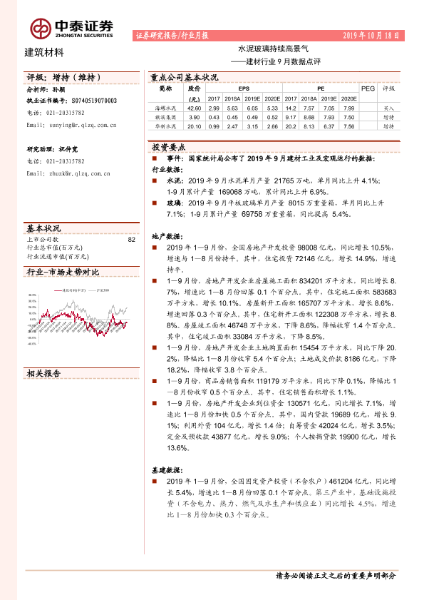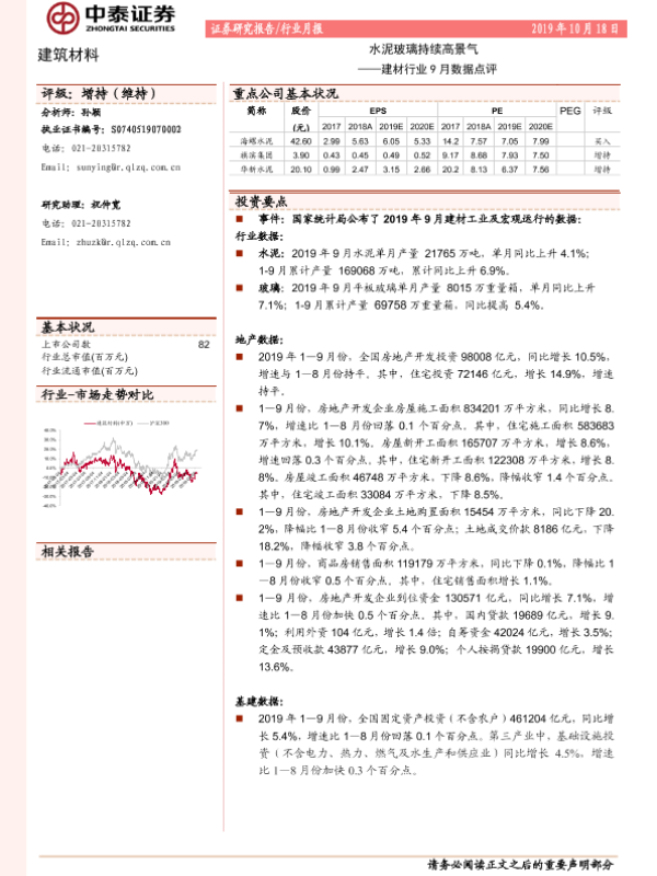 【中泰证券】【20191018】建材行业9月数据点评:水泥玻璃持续高景气-7页