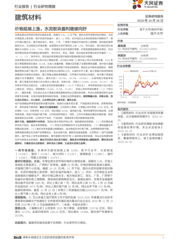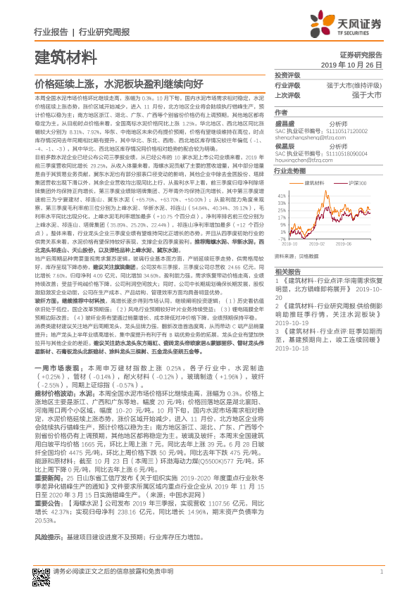 【天风证券】【20191026】建筑材料行业研究周报:价格延续上涨,水泥板块盈利继续向好-10页