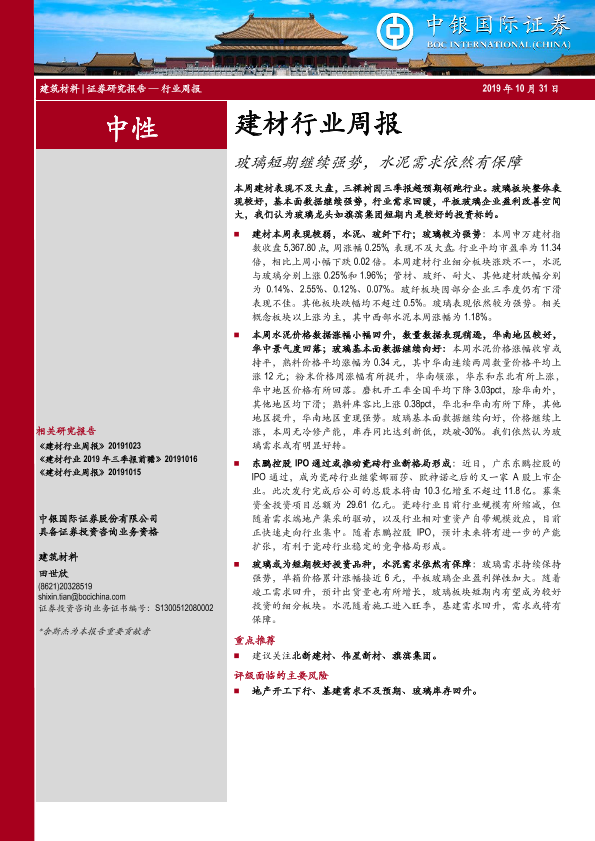 【中银证券】【20191031】建材行业周报:玻璃短期继续强势,水泥需求依然有保障-13页