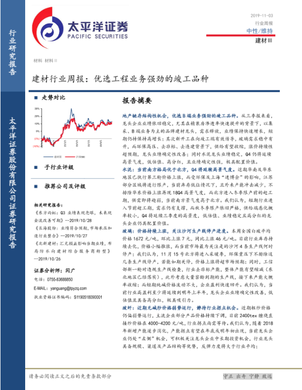 【太平洋证券】【20191103】建材行业周报:优选工程业务强劲的竣工品种-20页