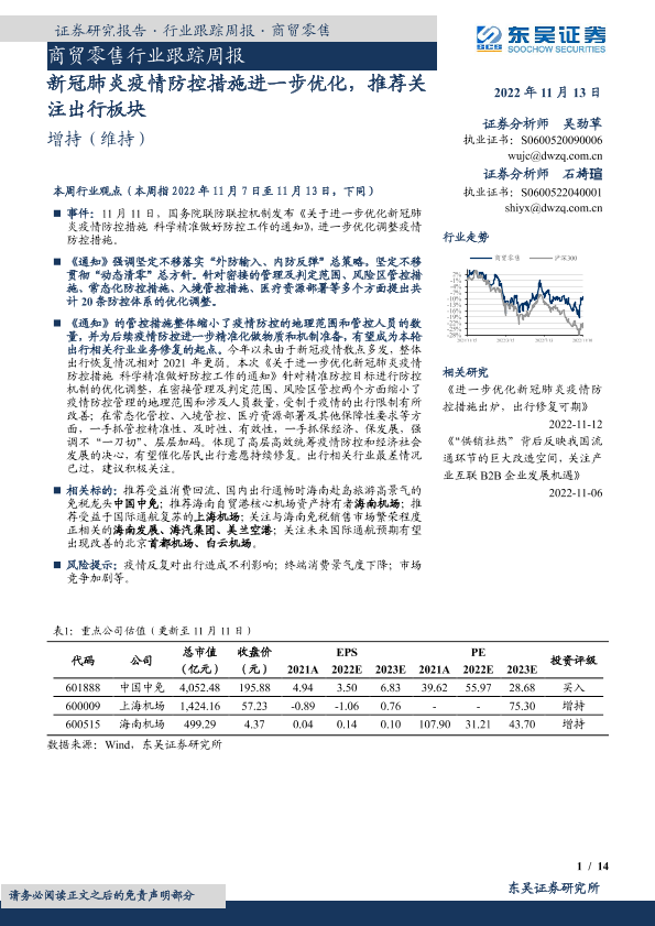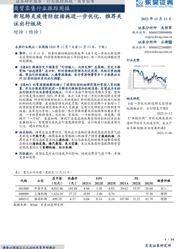 【东吴证券】【20221113】商贸零售行业跟踪周报:新冠肺炎疫情防控措施进一步优化,推荐关注出行板块-14页