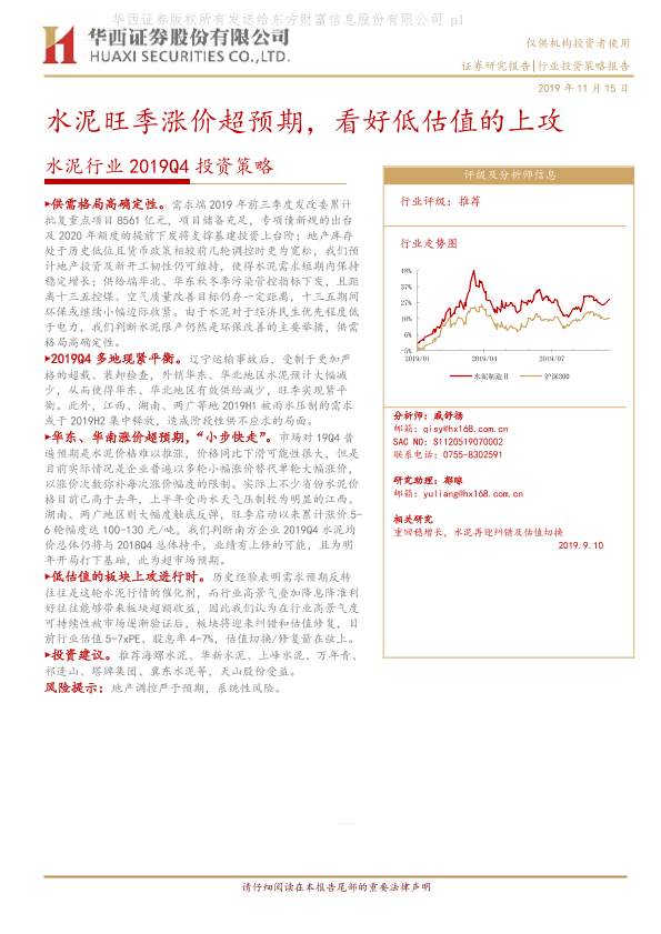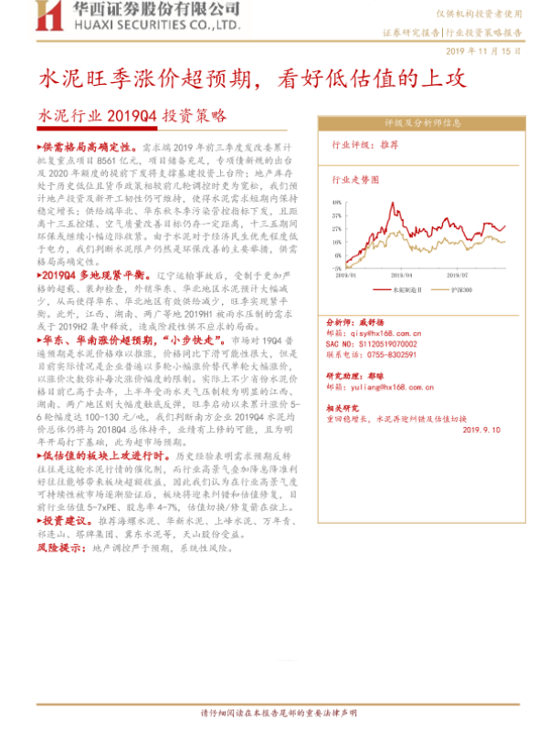 【华西证券】【20191115】水泥行业2019Q4投资策略:水泥旺季涨价超预期,看好低估值的上攻-17页