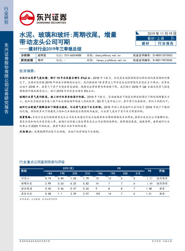 【东兴证券】【20191119】建材行业2019年三季报总结:水泥、玻璃和玻纤:周期收尾,增量带动龙头公司可期-17页