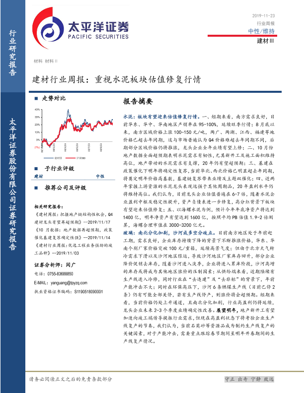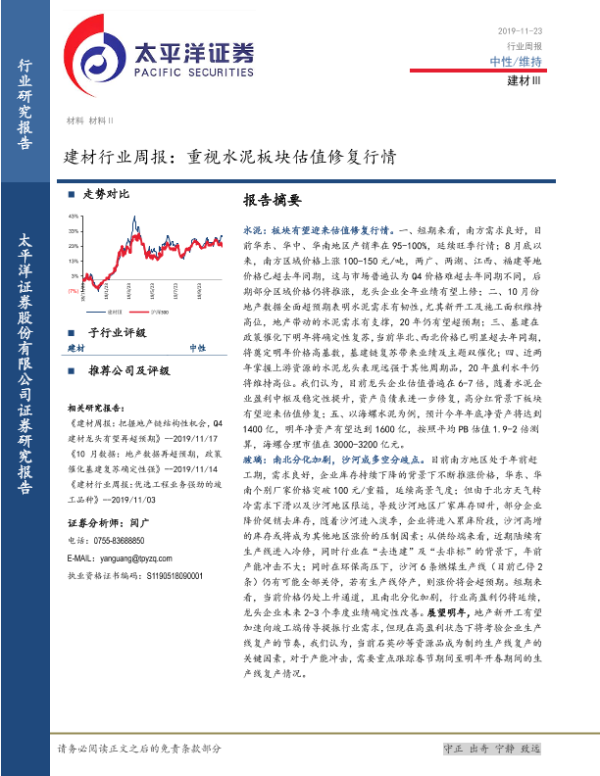 【太平洋证券】【20191123】建材行业周报:重视水泥板块估值修复行情-23页