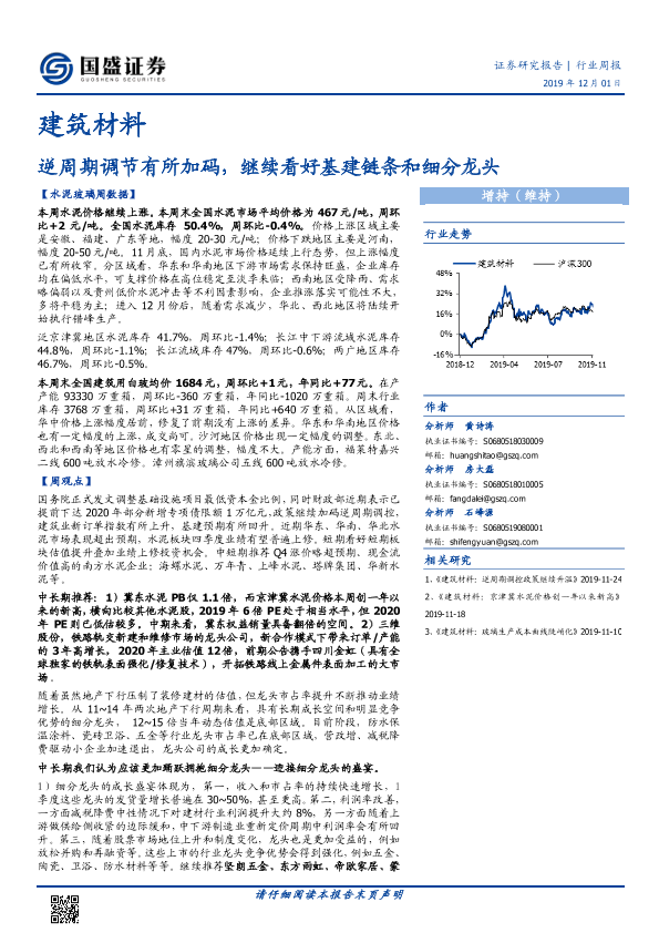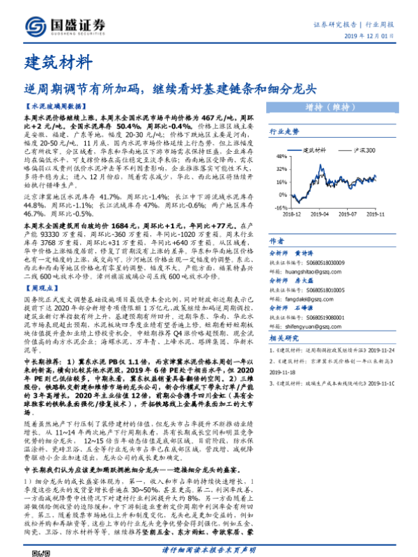 【国盛证券】【20191201】建筑材料行业周报:逆周期调节有所加码,继续看好基建链条和细分龙头-24页