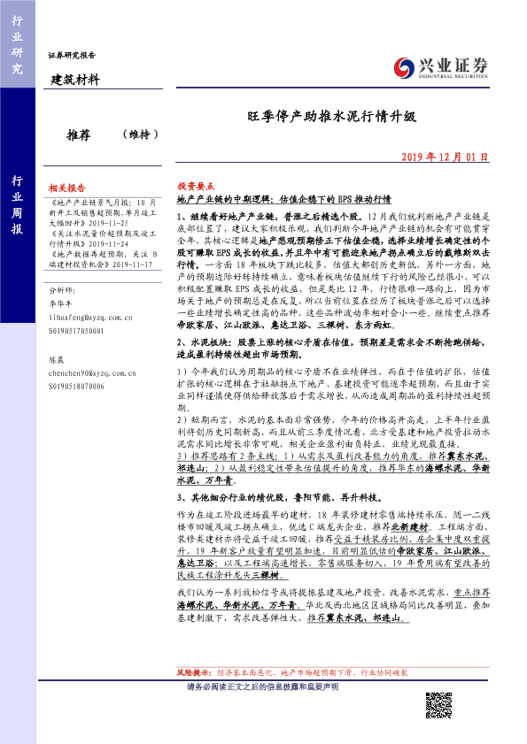 【兴业证券】【20191201】建筑材料行业周报:旺季停产助推水泥行情升级-17页