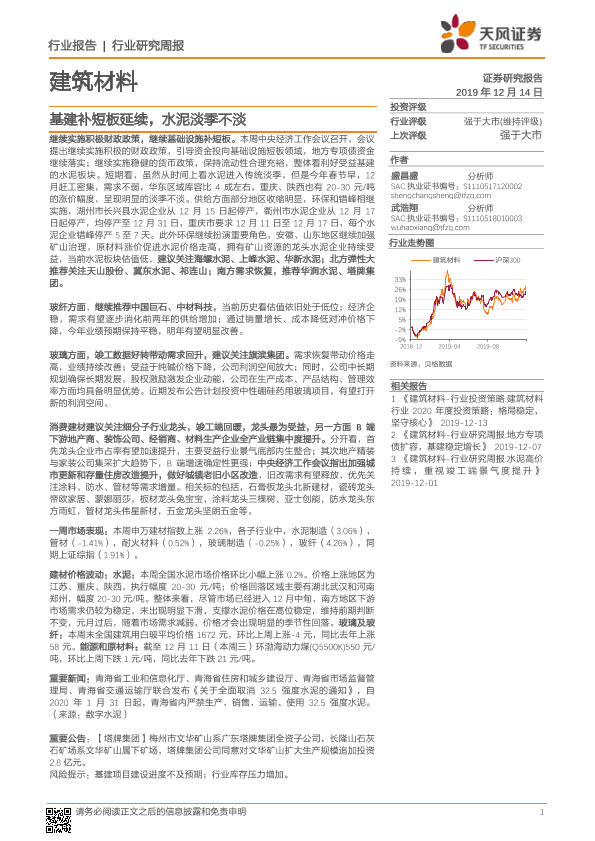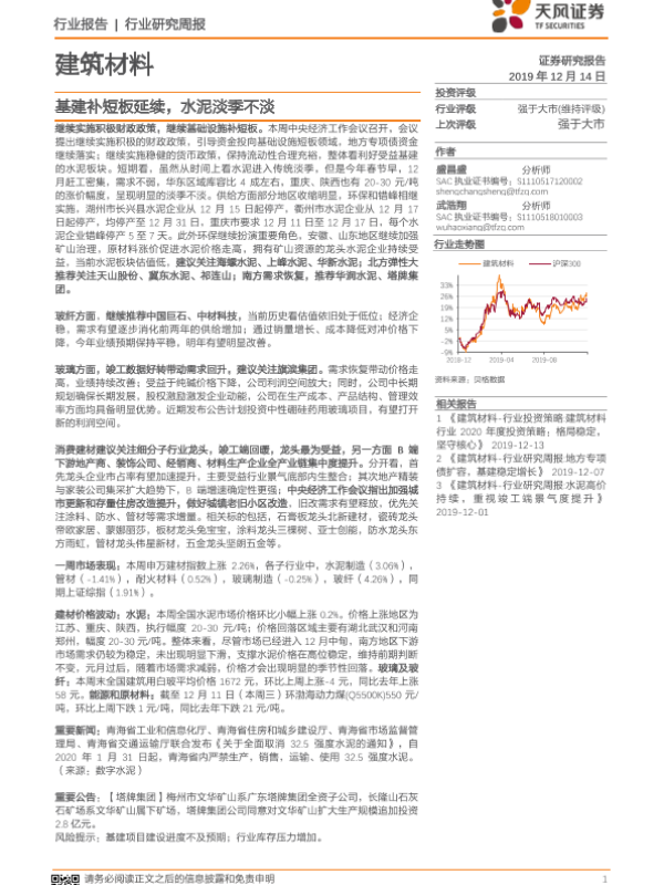 【天风证券】【20191214】建筑材料行业研究周报:基建补短板延续,水泥淡季不淡-9页