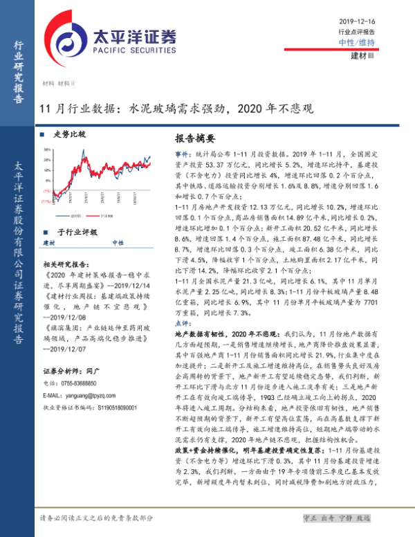 【太平洋证券】【20191216】11月行业数据:水泥玻璃需求强劲,2020年不悲观-7页