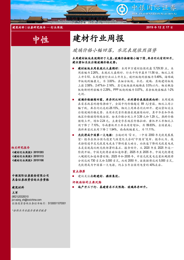 【中银证券】【20191217】建材行业周报:玻璃价格小幅回落,水泥表现依然强势-13页