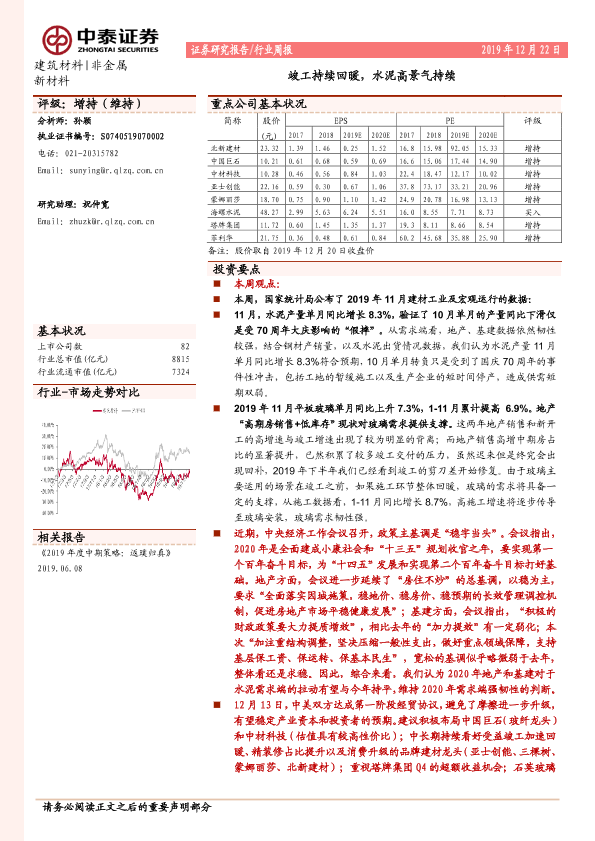 【中泰证券】【20191222】建筑材料行业周报:竣工持续回暖,水泥高景气持续-20页