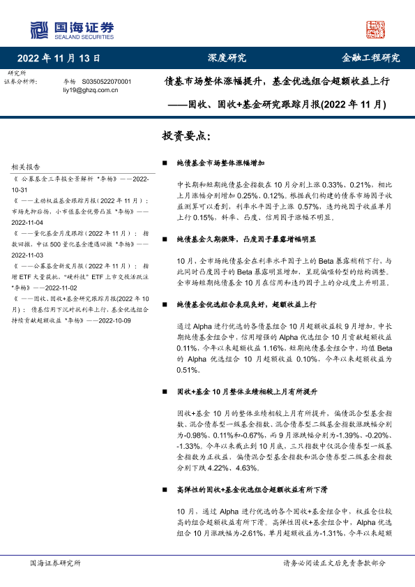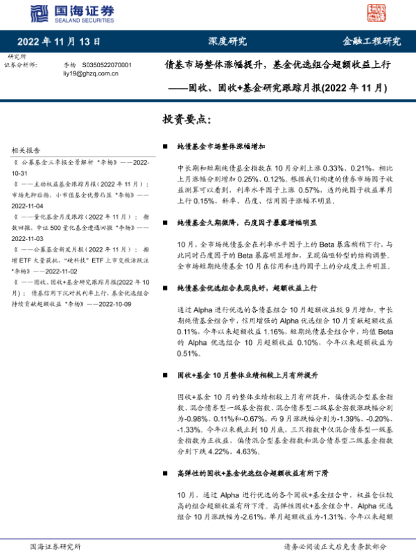 【国海证券】【20221113】固收、固收+基金研究跟踪月报(2022年11月):债基市场整体涨幅提升,基金优选组合超额收益上行-27页