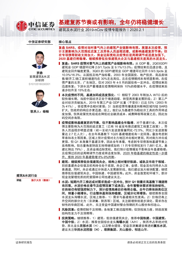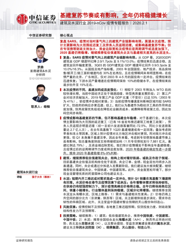 【中信证券】【20200201】建筑及水泥行业2019-nCov疫情专题报告:基建复苏节奏或有影响,全年仍将稳健增长-18页