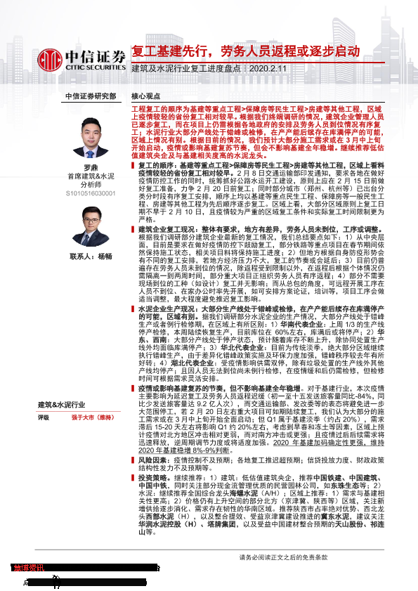 【中信证券】【20200211】建筑及水泥行业复工进度盘点:复工基建先行,劳务人员返程或逐步启动-5页