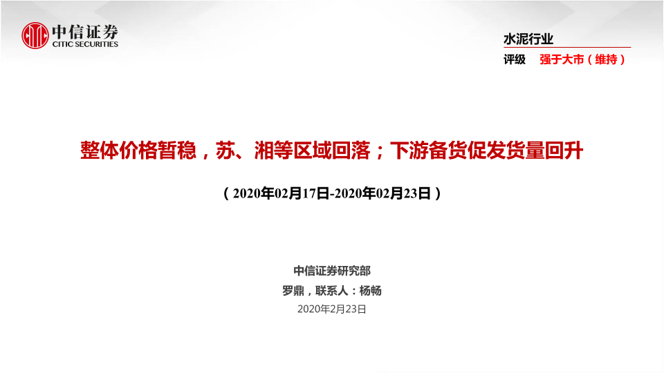 【中信证券】【20200223】水泥行业:整体价格暂稳,苏、湘等区域回落;下游备货促发货量回升-36页