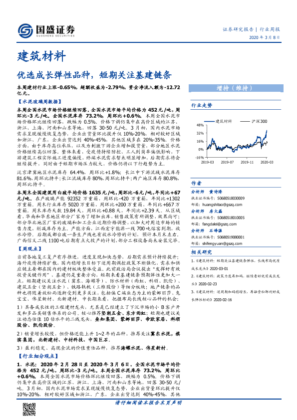 【国盛证券】【20200308】建筑材料行业周报:优选成长弹性品种,短期关注基建链条-27页