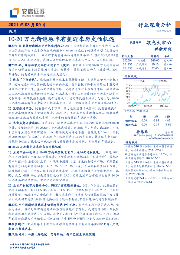 【安信证券】【20210809】汽车行业:10-20万元新能源车有望迎来历史性机遇-43页