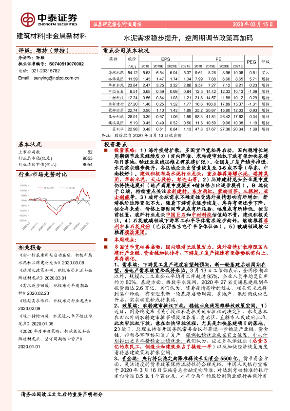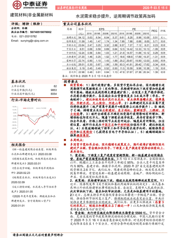 【中泰证券】【20200315】建筑材料 非金属新材料行业周报:水泥需求稳步提升,逆周期调节政策再加码-25页