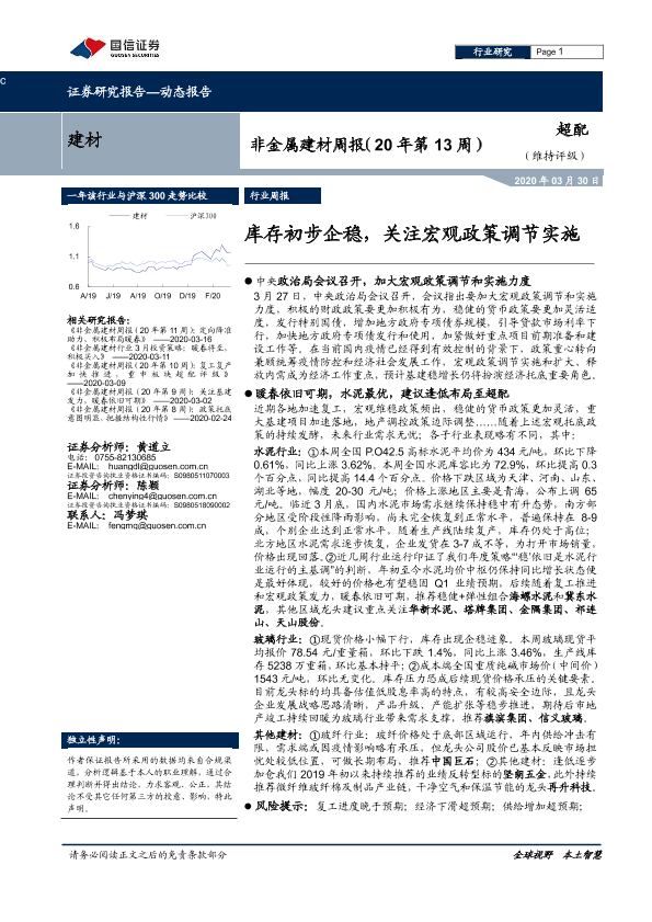 【国信证券】【20200330】非金属建材周报:库存初步企稳,关注宏观政策调节实施-15页