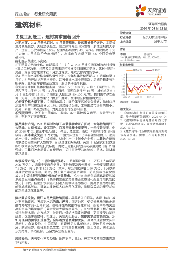 【天风证券】【20200412】建筑材料行业研究周报:由复工到赶工,建材需求显著回升-10页