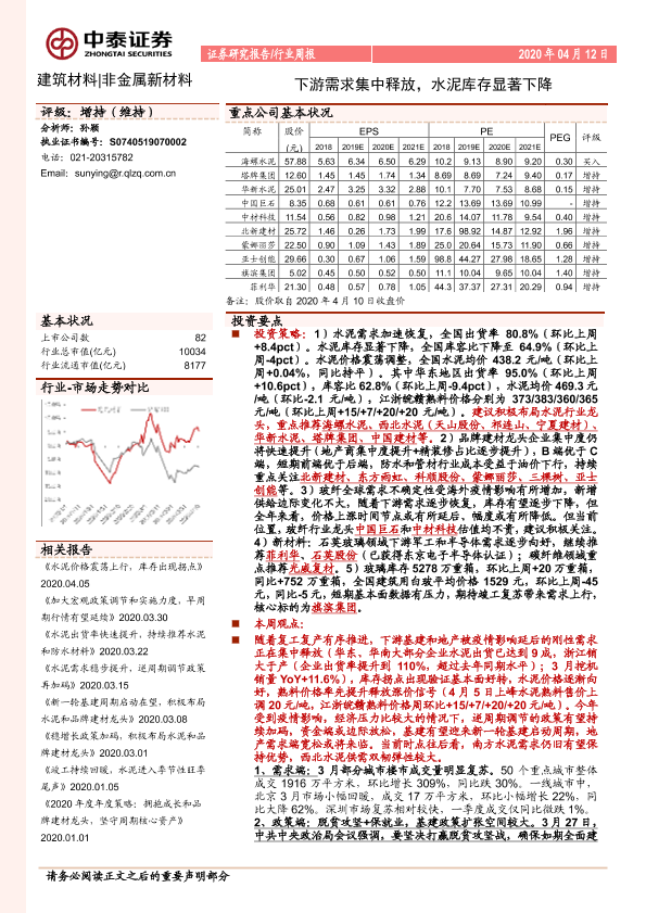 【中泰证券】【20200412】非金属新材料:下游需求集中释放,水泥库存显著下降-26页