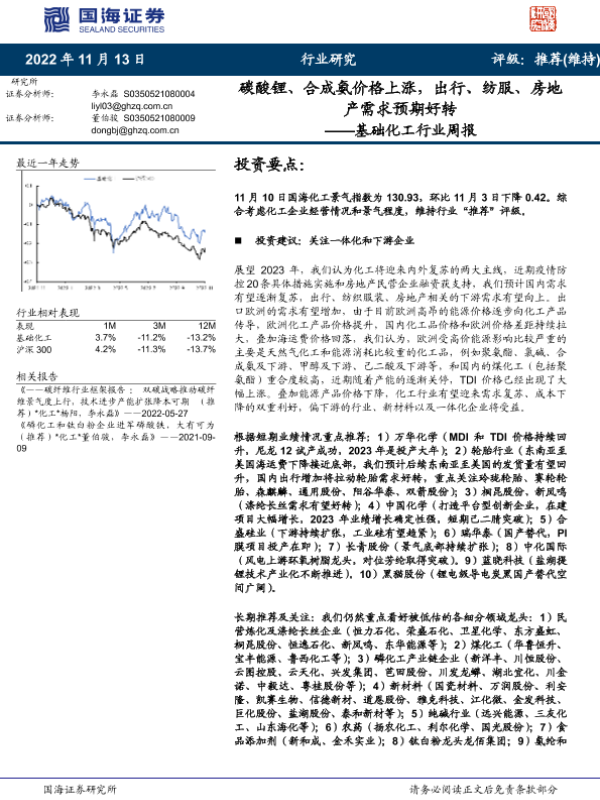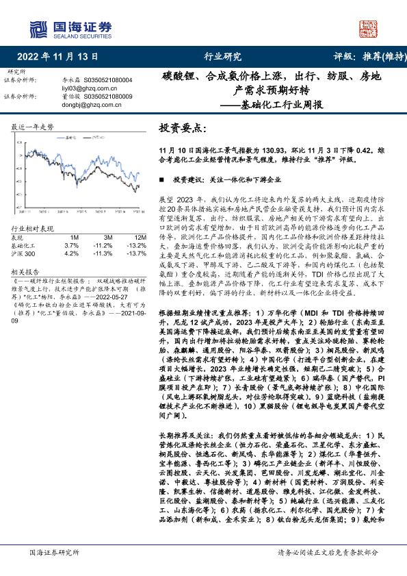 【国海证券】【20221113】基础化工行业周报:碳酸锂、合成氨价格上涨,出行、纺服、房地产需求预期好转-56页
