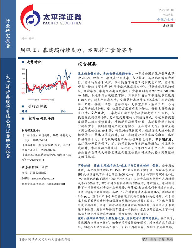 【太平洋证券】【20200418】建材Ⅲ周观点:基建端持续发力,水泥将迎量价齐升-20页