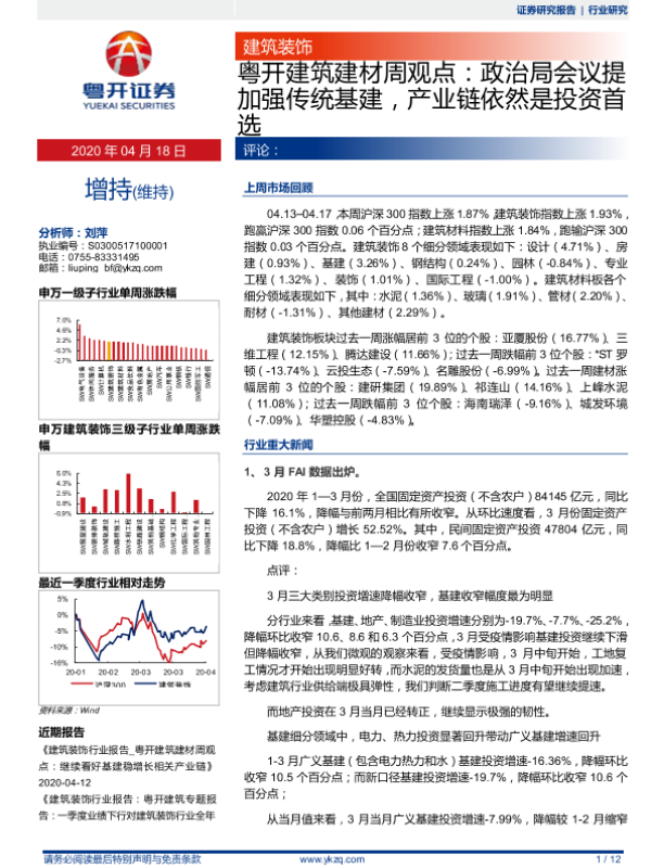 【粤开证券】【20200418】粤开建筑建材周观点:政治局会议提加强传统基建,产业链依然是投资首选-12页