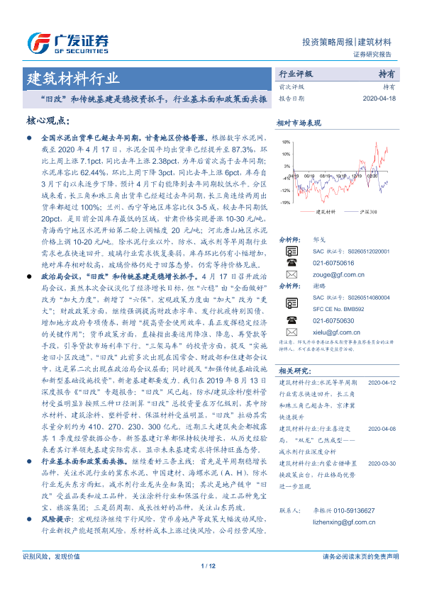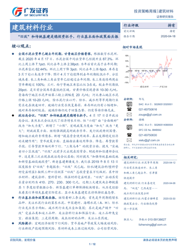 【广发证券】【20200418】建筑材料行业投资策略周报:“旧改”和传统基建是稳投资抓手,行业基本面和政策面共振-12页