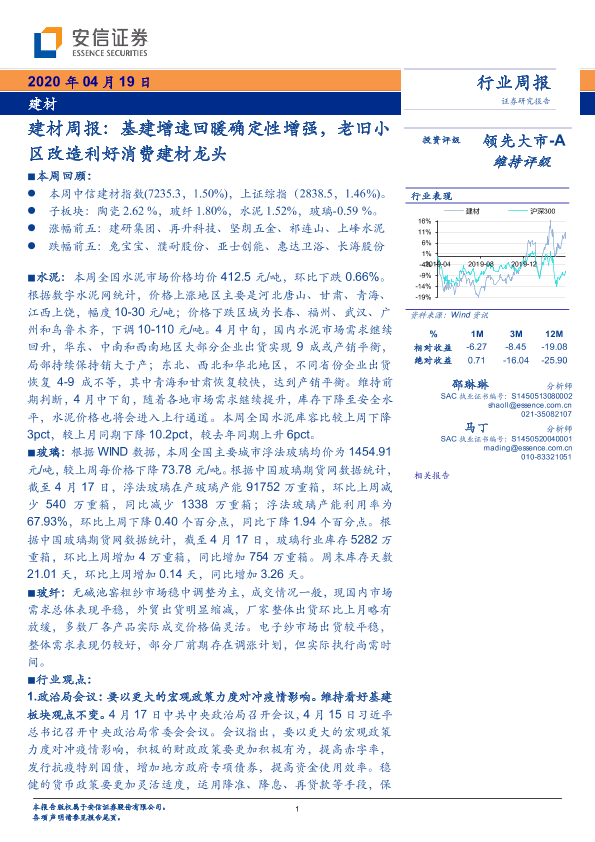 【安信证券】【20200419】建材周报:基建增速回暖确定性增强,老旧小区改造利好消费建材龙头-18页