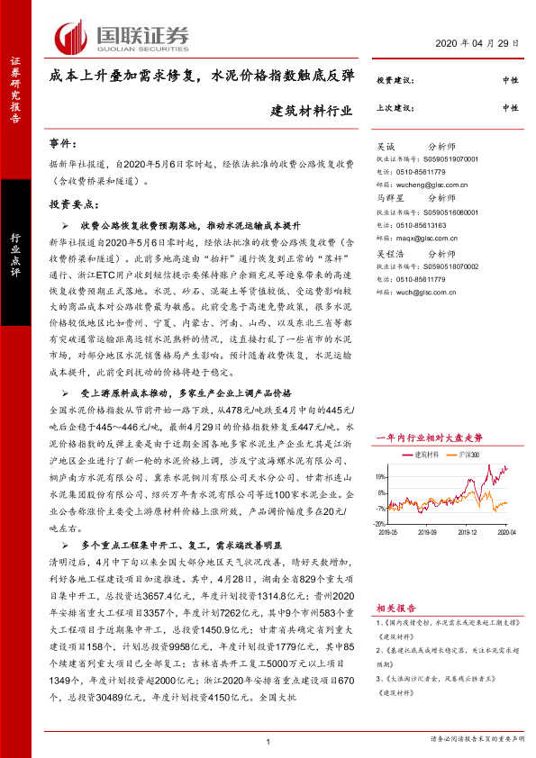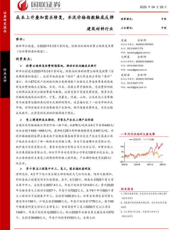【国联证券】【20200429】建筑材料行业:成本上升叠加需求修复,水泥价格指数触底反弹-3页