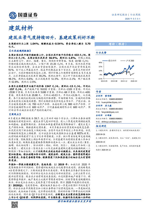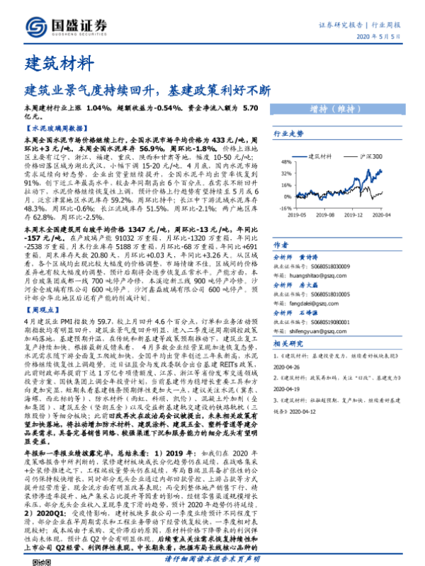 【国盛证券】【20200505】建筑材料行业周报:建筑业景气度持续回升,基建政策利好不断-26页