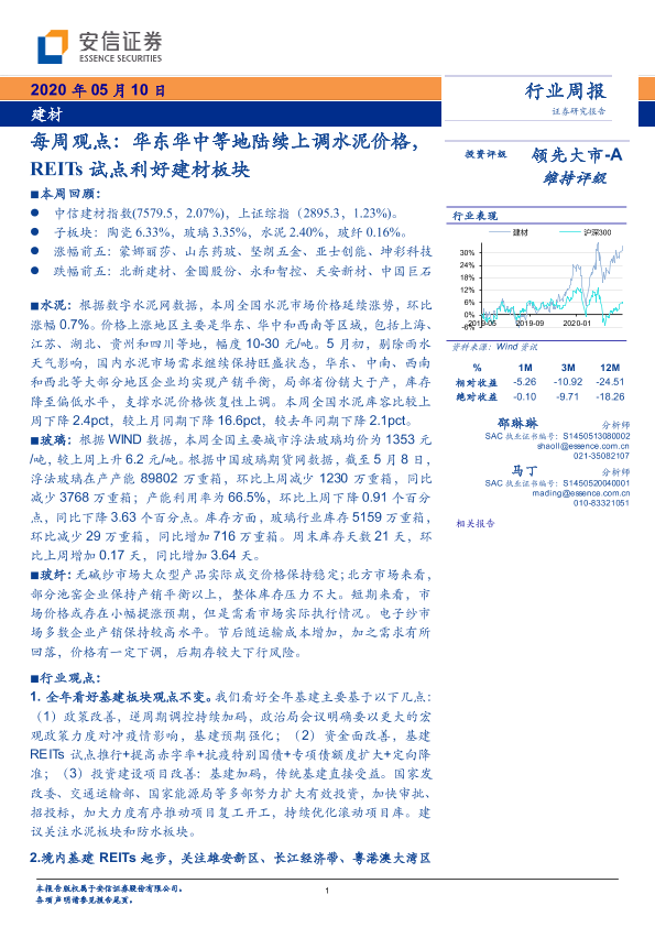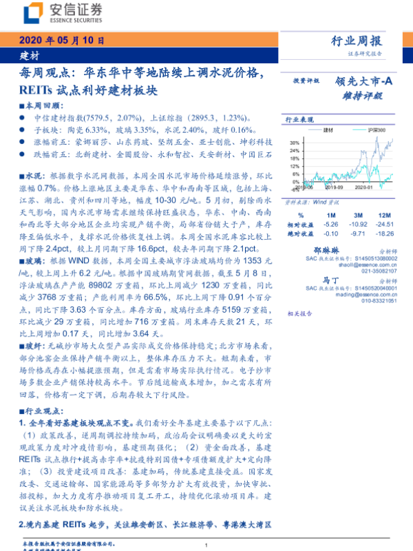 【安信证券】【20200510】每周观点:华东华中等地陆续上调水泥价格,REITs试点利好建材板块-16页