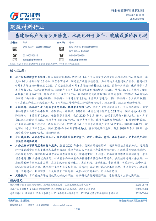 【广发证券】【20200517】建筑材料行业:基建和地产投资明显修复,水泥已好于去年,玻璃最差阶段已过-16页