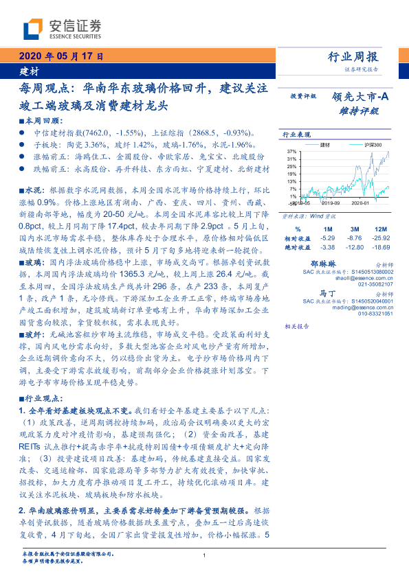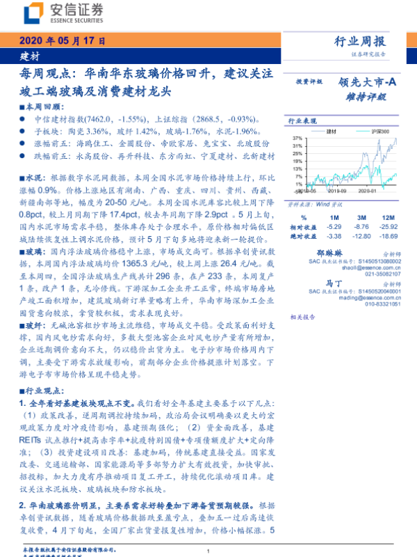 【安信证券】【20200517】建材每周观点:华南华东玻璃价格回升,建议关注竣工端玻璃及消费建材龙头-18页