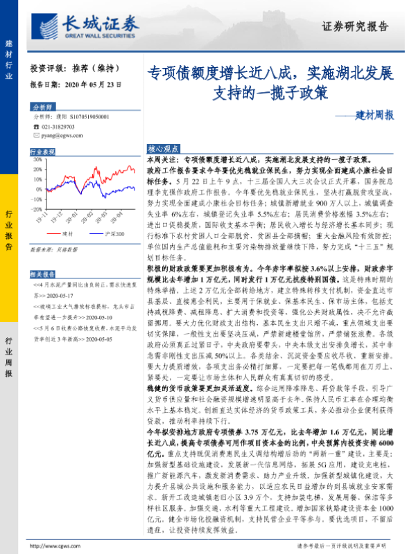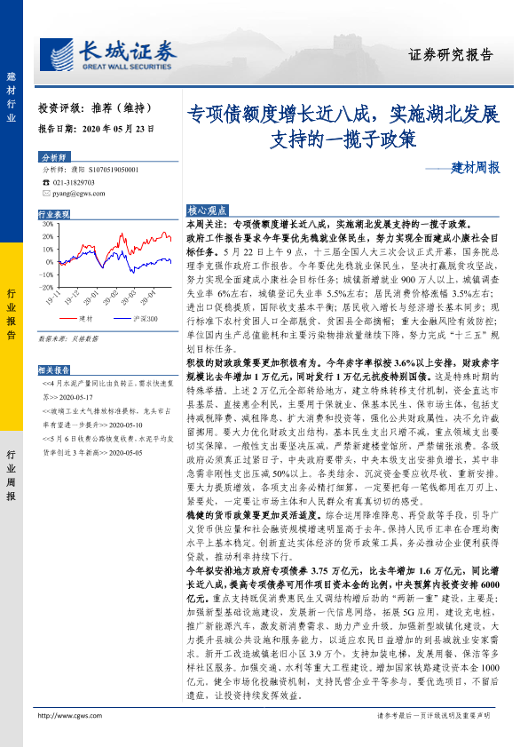 【长城证券】【20200523】建材周报:专项债额度增长近八成,实施湖北发展支持的一揽子政策-19页