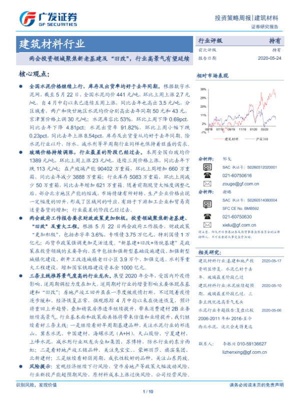 【广发证券】【20200524】建筑材料行业投资策略周报:两会投资领域聚焦新老基建及“旧改”,行业高景气有望延续-10页