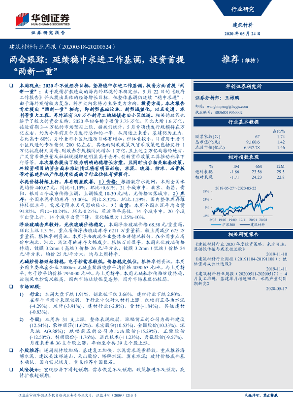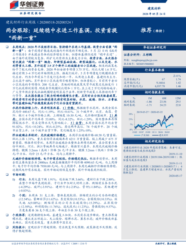 【华创证券】【20200524】建筑材料行业周报:两会跟踪:延续稳中求进工作基调,投资首提“两新一重”-15页