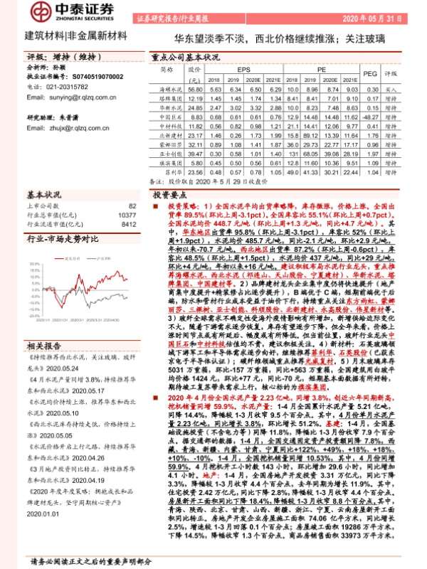 【中泰证券】【20200531】建筑材料 非金属新材料行业周报:华东望淡季不淡,西北价格继续推涨;关注玻璃-25页