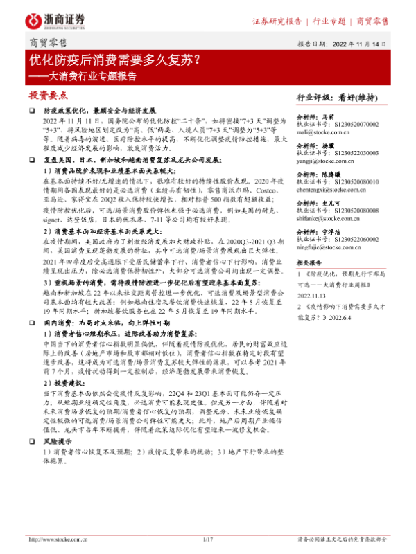 【浙商证券】【20221114】大消费行业专题报告:优化防疫后消费需要多久复苏?-17页