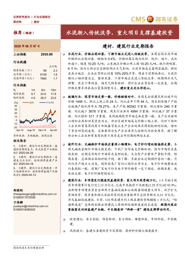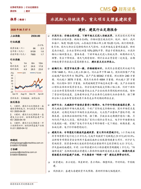 【海通证券】【20200607】建材、建筑行业定期报告:水泥渐入传统淡季,重大项目支撑基建投资-34页