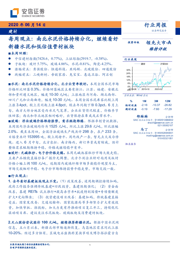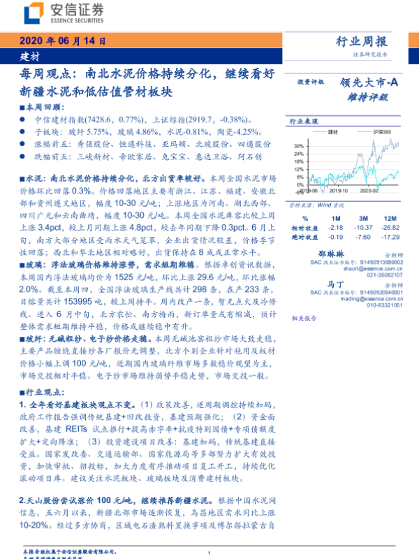 【安信证券】【20200614】建材每周观点:南北水泥价格持续分化,继续看好新疆水泥和低估值管材板块-18页