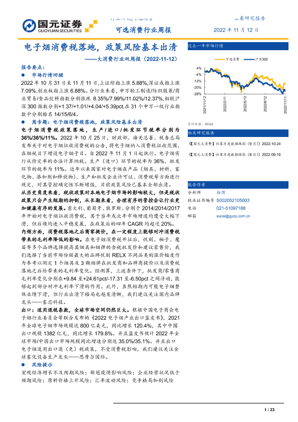 【国元证券】【20221112】大消费行业双周报:电子烟消费税落地,政策风险基本出清-23页