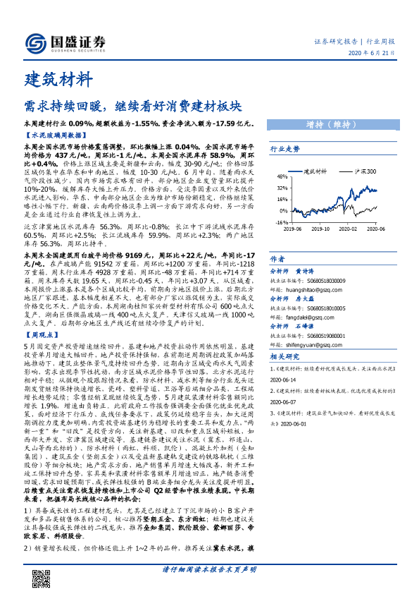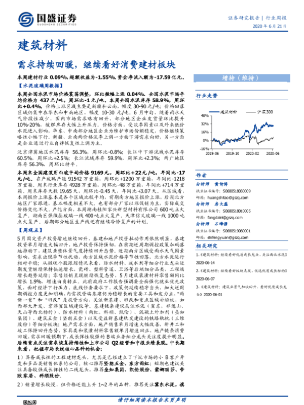 【国盛证券】【20200621】建筑材料行业周报:需求持续回暖,继续看好消费建材板块-23页