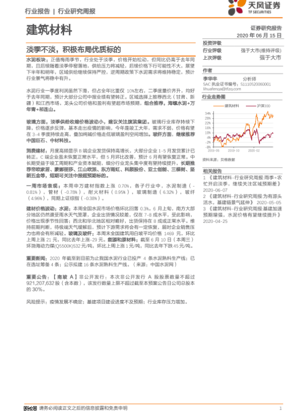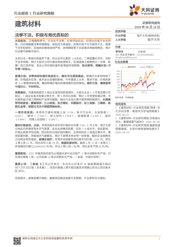 【天风证券】【20200615】建筑材料行业研究周报:淡季不淡,积极布局优质标的-9页