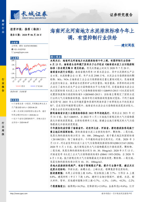 【长城证券】【20200628】建材周报:海南河北河南地方水泥排放标准今年上调,有望抑制行业供给-20页