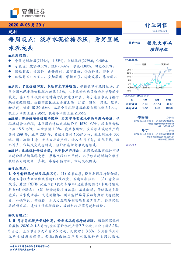 【安信证券】【20200629】建材每周观点:淡季水泥价格承压,看好区域水泥龙头-17页