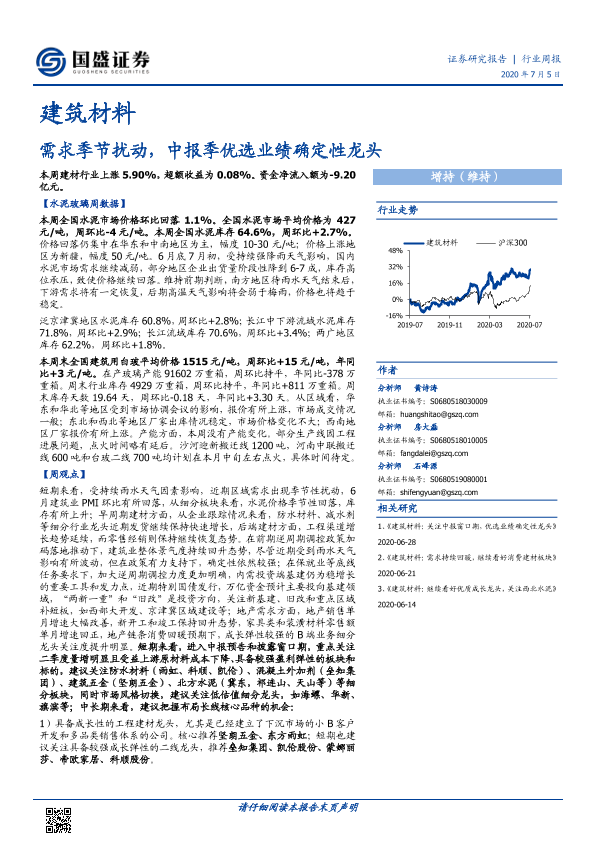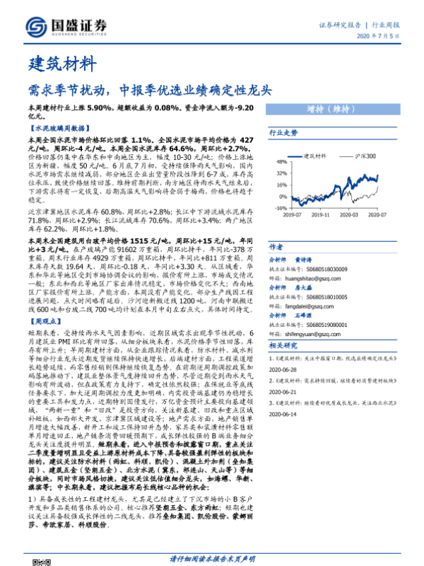 【国盛证券】【20200705】建筑材料行业周报:需求季节扰动,中报季优选业绩确定性龙头-22页