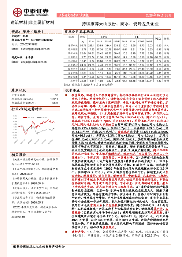 【中泰证券】【20200705】建筑材料行业周报:持续推荐天山股份、防水、瓷砖龙头企业-26页