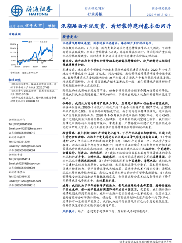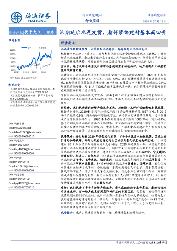 【海通证券】【20200712】建材行业周报:汛期延后水泥发货,看好装饰建材基本面回升-3页
