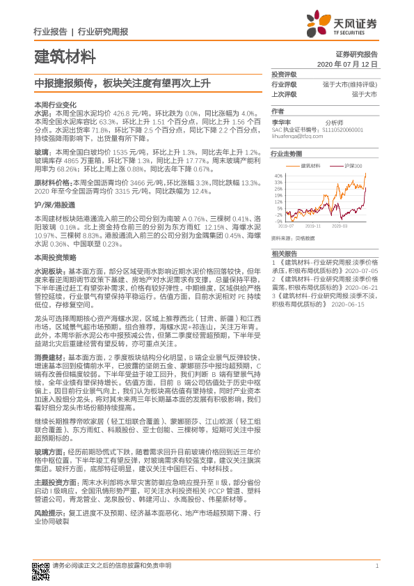 【天风证券】【20200712】建筑材料行业研究周报:中报捷报频传,板块关注度有望再次上升-16页